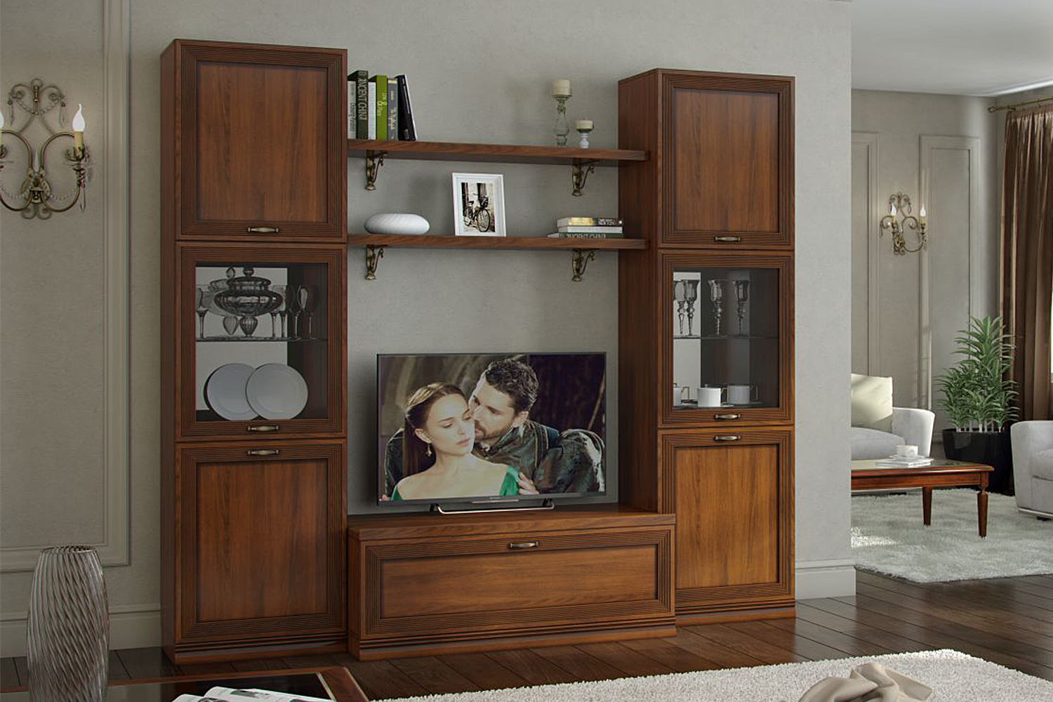 Специально выбирал мебель для гостиной, чтобы она сочетала в себе стиль классицизма и модерна. Перебрал несколько вариантов и остановился на Адажио. Когда привезли и установили, то телевизор аккуратно поместился в нише шкафа. Не думал, что так повезет, проверил дверки, они хорошо открываются и не скрипят. В общем, мебелью доволен, претензий к магазину нет.