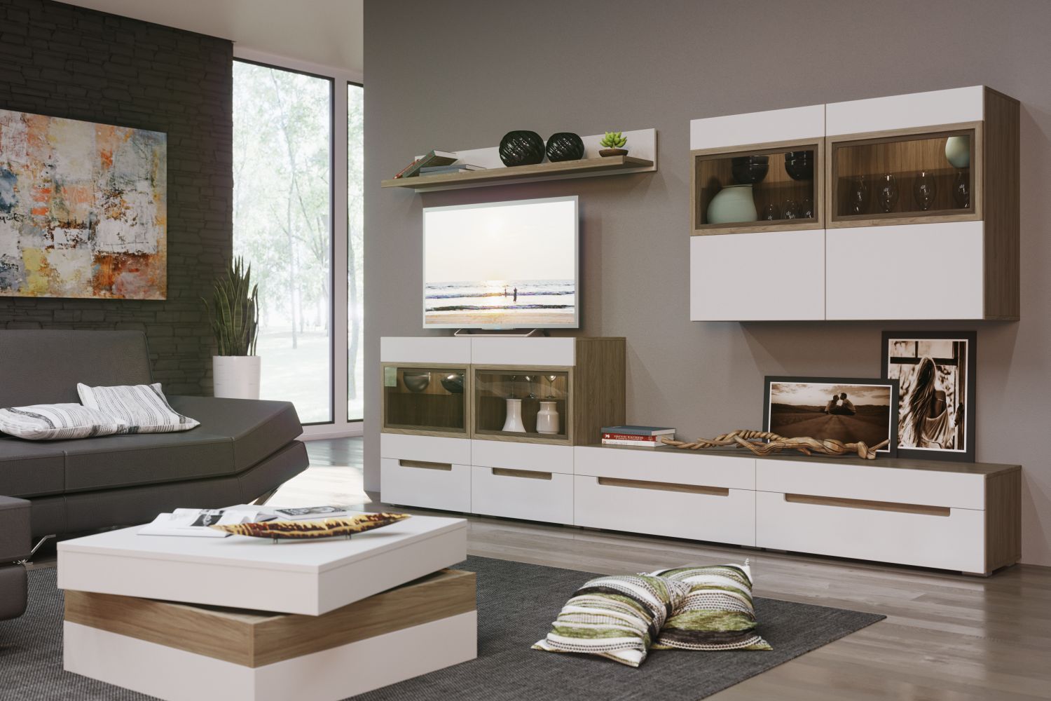 • Гостиная в современном минималистичном стиле. Такая мебель универсальна и подойдет интерьерам в стилях эко, скандинавский, минимализм и лофт (в его более «легком» варианте);