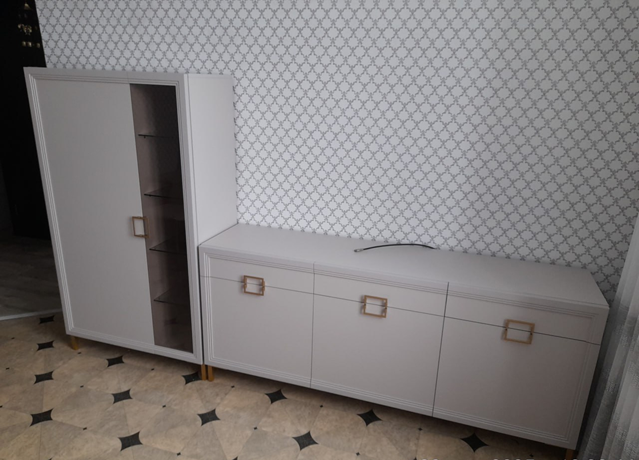 - Внутреннее наполнение: 4 стеклополки 6 мм за стеклянным фасадом, и 1 полка ЛДСП 16 мм — за глухим;