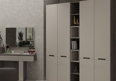 - Фасады выполнены из МДФ, цвет бежево-серый;